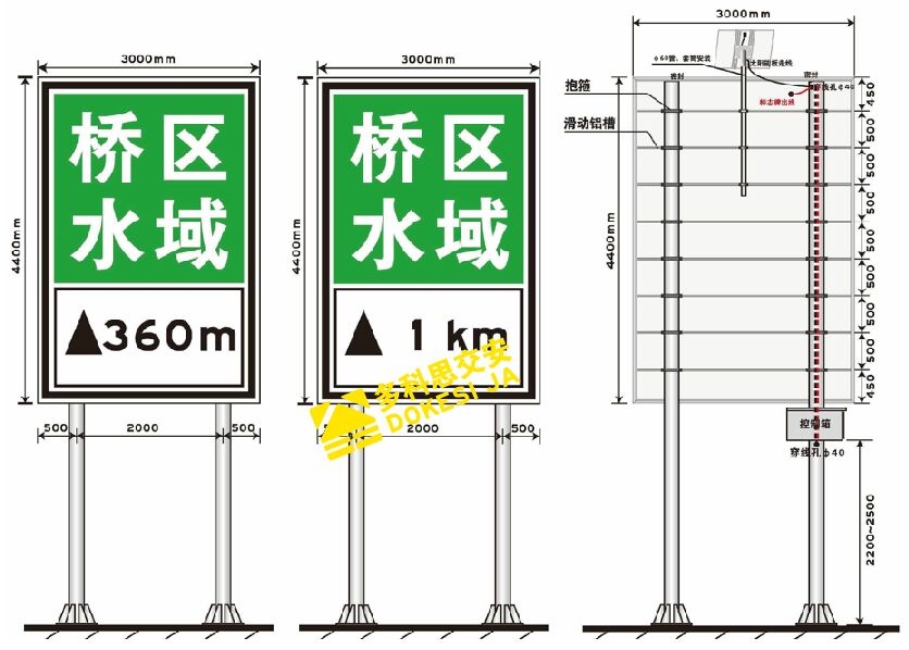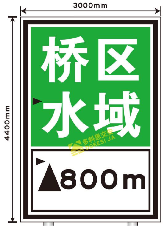 标志设置于河道水域两岸合适位置,主要用于告知通行船舶注意前方桥区水域的划定范围,方便船舶驾驶员能准确、及时获取航道水域相关信息。其版面分上下两部分:上部,蓝底白字(桥区水域);下部,白底黑字(三角+距离数字);整体黑色边框。版面尺寸通常为:3000mm *4400mm。通常采用双立柱安装方式。