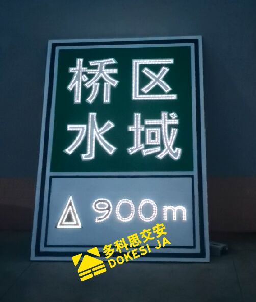 ”桥区水域“航道发光指示标志,采用LED嵌入式主动发光工艺,将国标IV反光膜的反光特性与LED的光源发光特性有效融合,实现发光版面从点光源发光,到线条轮廓发光融合,再到整体版面的视觉成像融合,呈现一种适合人眼瞳孔观察舒适度范围内的光像效果,在黑暗的航道环境中,大大增强”桥区水域“航道发光指示标志的夜间视认效果。普通的”桥区水域“航道指示标志,通常安装于河道两岸,船舶行经时,存在一定的视认夹角,在远处,用船灯照射,虽看见发光,但看不清具体版面内容;在近处,由于存在河道夹角,常常超出的船灯的照射范围。而采用LED主动发光的”桥区水域“航道指示标志,不仅不需要外部光源照射,同时在较大的观察角内,仍能清晰辨认。