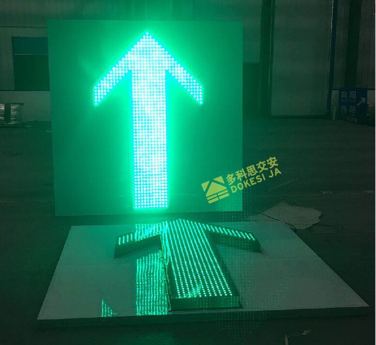 单向通航桥孔发光标志,其整体版面为:白色的正方形底板+绿色箭头,尺寸通常采用2000mm*2000mm规格,主要安装设置于桥梁下方通航桥孔的最佳位置,用于标识桥孔下方的正向航道,告知本航道为单向通航,指示船舶按照规定的航道方型靠通行,以免发生船舶碰撞事故的危险隐患。为提升“单向通航桥孔”在夜间的警示效果,和远距离的可视性,标志已逐步升级为主动发光功能,在标志的四个侧边,等距离嵌入高亮LED发光管,通过内部的精密电路,实现标志在夜间的动态闪烁功能。产品生产测试照片如下: